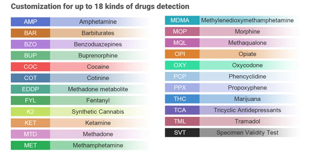 The Multi-Drug One Step Test Kit is a rapid urine test for the qualitative screening of multiple drugs and their metabolites. Utilizing colloidal gold methodology, it is designed to detect the presence of up to 23 drugs, including COC, AMP, MOP, and THC.